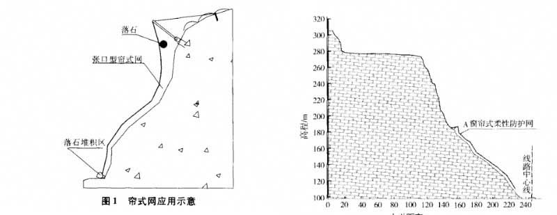 窗簾式柔性防護網采用“引導”的理念控制歐式,即通過柔性防護網與山體間的夾縫對落石進行引導和約束。讓落石按照規定好的線路滾落到指定的落石堆積區。