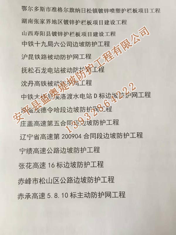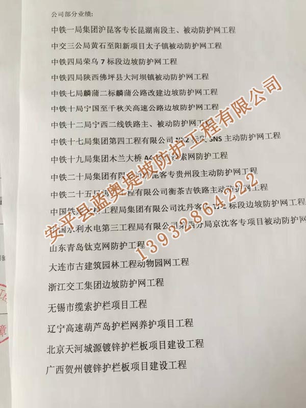 全部各地的客戶朋友們打進電話會咨詢一下邊坡防護網產品的問題,產品了解清楚后有的朋友會考察一下公司情況。這樣的客戶朋友我們是非常尊重的,了解供貨方公司實力這是最自己負責對工程負責。因此我們會提供我公司的相關資質、產品質量檢測報告、進場施工證明等。其實可以通過公司的工程業績(承接的工程項目)來證明公司實力。有些客戶會來我公司考察,為了客戶更方便的了解我們之前做過的一些項目,我們將最近3年施工過的邊坡防護網工程業績做了一下統計,并打印出來。