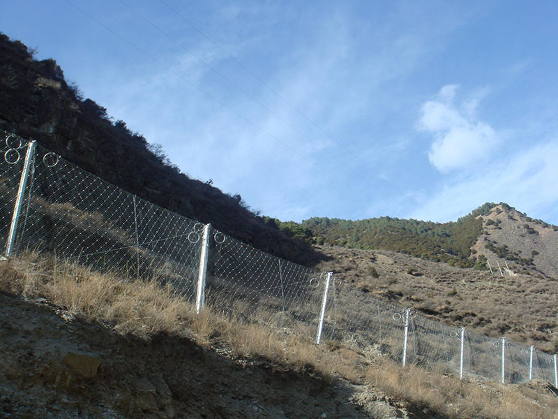 2. 每組被動防護網上下都有兩個支撐繩將立柱與鋼絲繩網緊密的結合在一起,起到共同防護的效果,支撐繩的直徑一般為∮18,可以對落石進行有效的攔截。