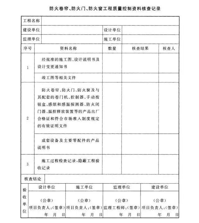 2、防火卷簾、防火門、防火窗工程質量驗收前,施工單位應提供下列文件資料,并應按下表填寫資料核查記錄: